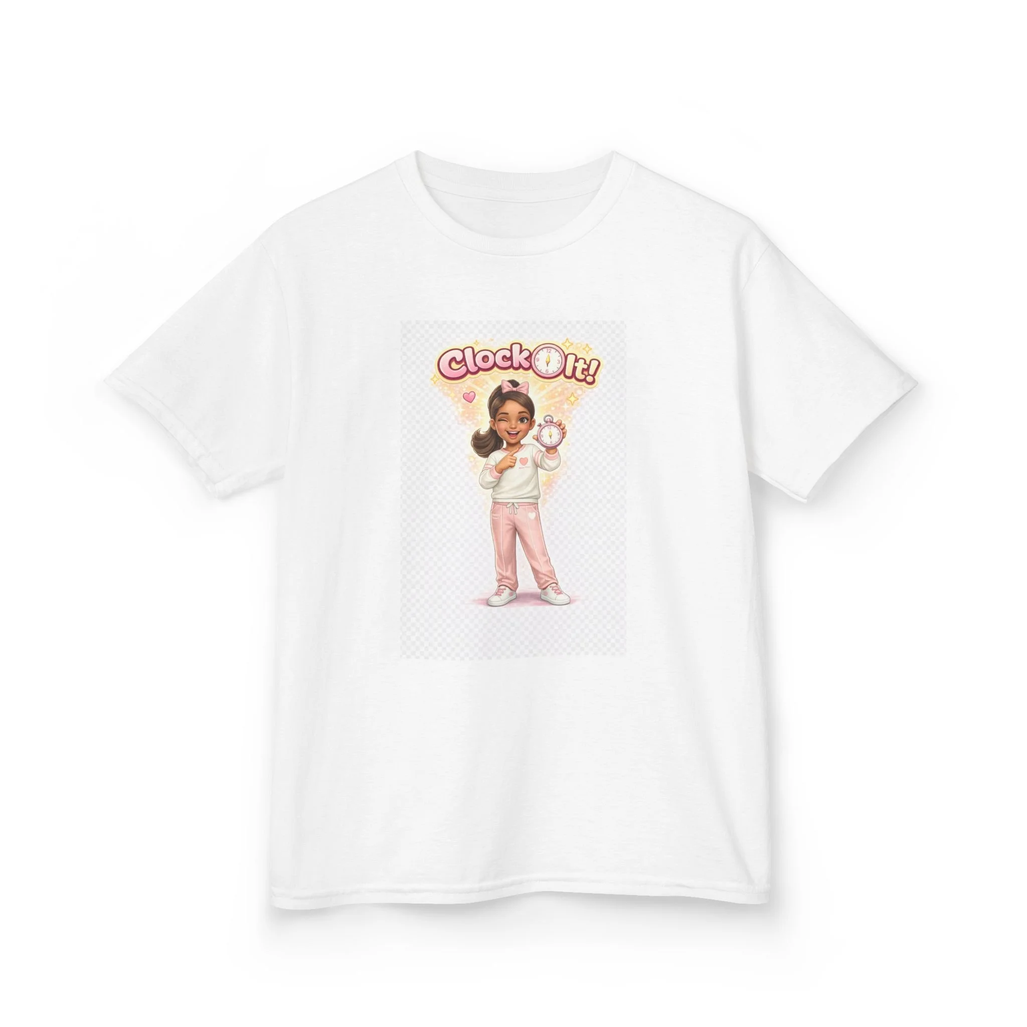 Kids Tee — "Clock It!" Cute Retro Girl Illustration