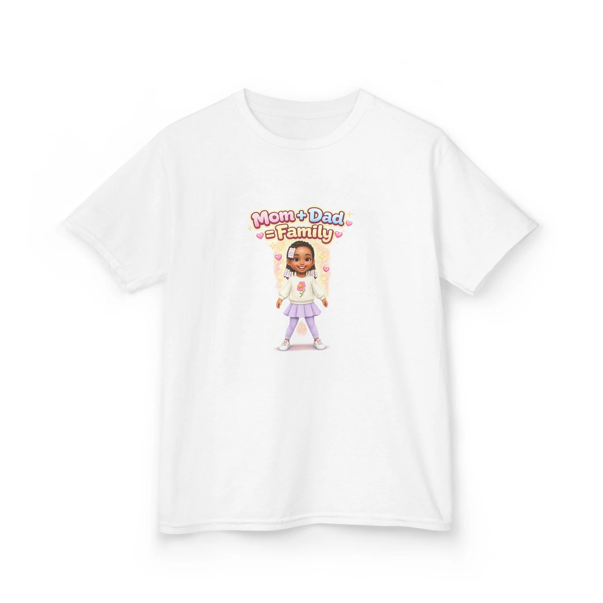 A soft, midweight kids tee featuring a warm, playful illustration celebrating family. The small front print shows a smiling child character with the phrase “Mom + Dad = Family,” rendered in cheerful pastel tones that sit gently against the white shirt. Lightweight but sturdy, the classic crew-neck silhouette and tubular knit body keep the fit simple and comfortable for everyday wear. The design reads like a quiet note of belonging—made for little ones who like to move, play, and feel seen by the people who matter most.